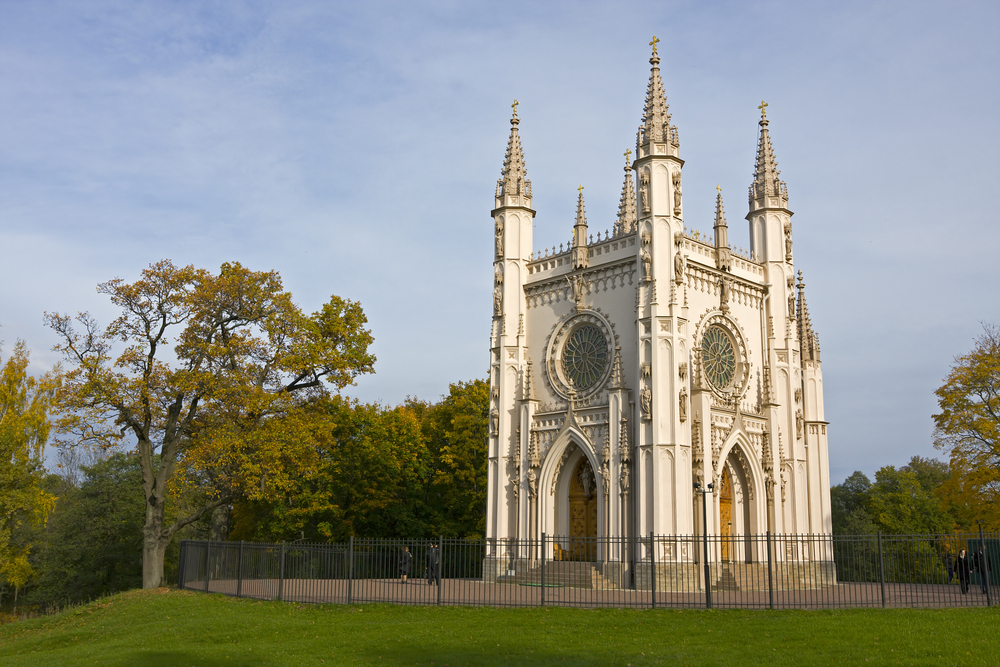 En el parque Aleksandría fueron construidos unos museos muy interesantes desde punto de vista arquitectónico e histórico. Paseando por las arboledas bien pensadas por los extranjeros maestros de jardines Vendelsdorf, Gombel y Erler, visitaremos la iglesia ricamente adornada en el estilo gótico. Por su tamaño y decoración exquisita parece a la iglesia de juguetes o una caja de joyas. Esta iglesia privada de la emperatriz es ortodoxa a pesar de su decoración en el estilo gótico.