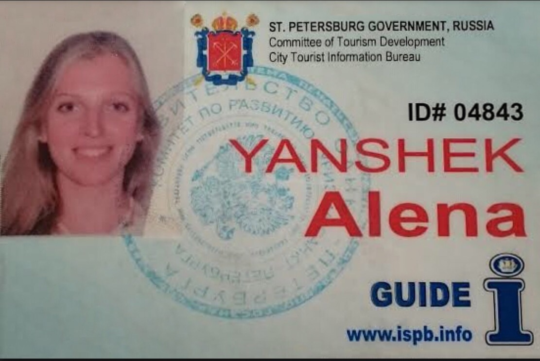 Soy Alena Yanshek (Ianshek) , guía turística oficial e intérprete de San Petersburgo, además soy empresario individual registrado por el gobierno de Rusia.